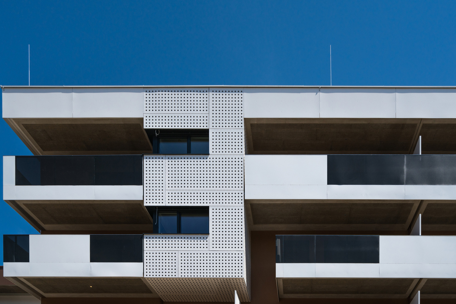 Die Hauptfassade besteht aus braunem VWS-Putz. Als Kontrast dazu werden die von der Fassade hervor- springenden Erker mit gelochten Aluminium-Platten eingekleidet. Die Farbbeschichtung dieser Alu-Platten wechselt zwischen einem Braunton, ähnlich der Putzfarbe, und einem Weiß. Die Lochung verläuft regel- mäßig über die Erker-Außenfläche. Ebenso wie die Ansichtsflächen werden auch die Untersichten der jeweiligen Erker mit gelochten Paneelen verkleidet.